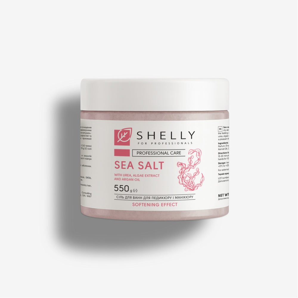 Підтримувати ідеальний стан нігтьової пластини, шкіри рук і ніг допоможуть спа-процедури з використанням солі для ванн Shelly. Морська сіль для манікюру та педикюру не тільки ідеально підготує до процедури, а й забезпечить безсумнівну користь для шкіри і нігтів та доповнить приємними відчуттями. Засіб відрізняється ефективною формулою, що делікатно впливає на шкіру, запобігаючи її сухості. Сечовина в складі солі інтенсивно зволожує шкіру рук та ніг, покращує кровообіг та дозволяє розм'якшити загрубілі ділянки. Екстракт водоростей та олія аргани сприяють усуненню відчуття втоми, загоєнню мікротріщин, підвищенню тонусу шкіри. При регулярному застосуванні ванночки з додаванням солі нігті стають міцними і здоровими, а шкіра рук і ніг - гладкою і зволоженою!